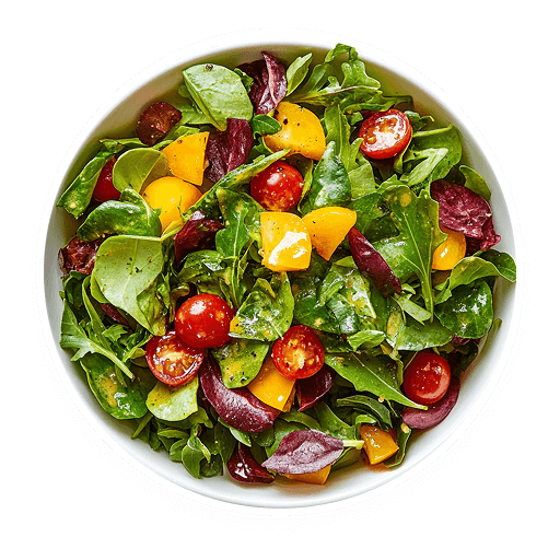 Mixed baby greens, arugula, cherry tomatoes, orange segments, cucumber slices, red onions, feta cheese crumbles, toasted sunflower seeds,